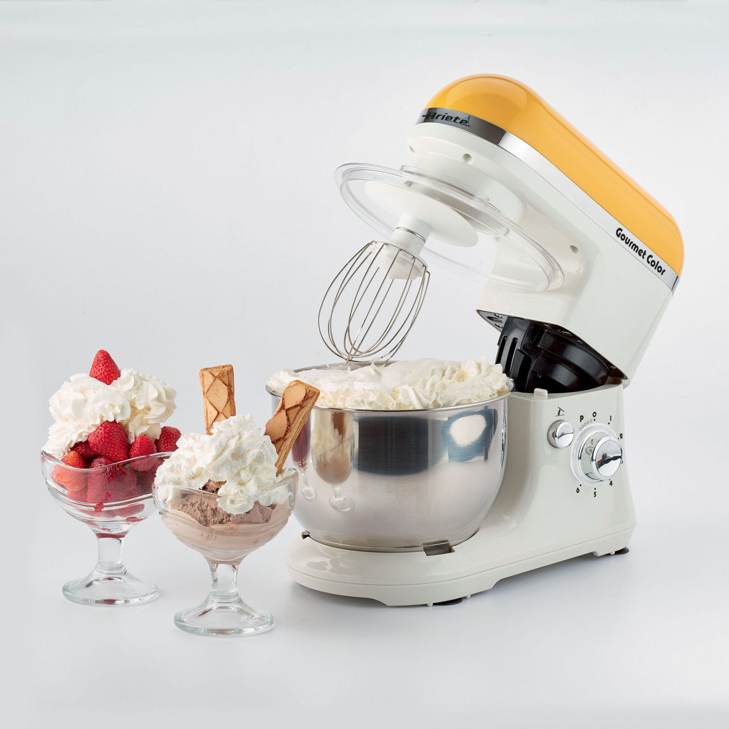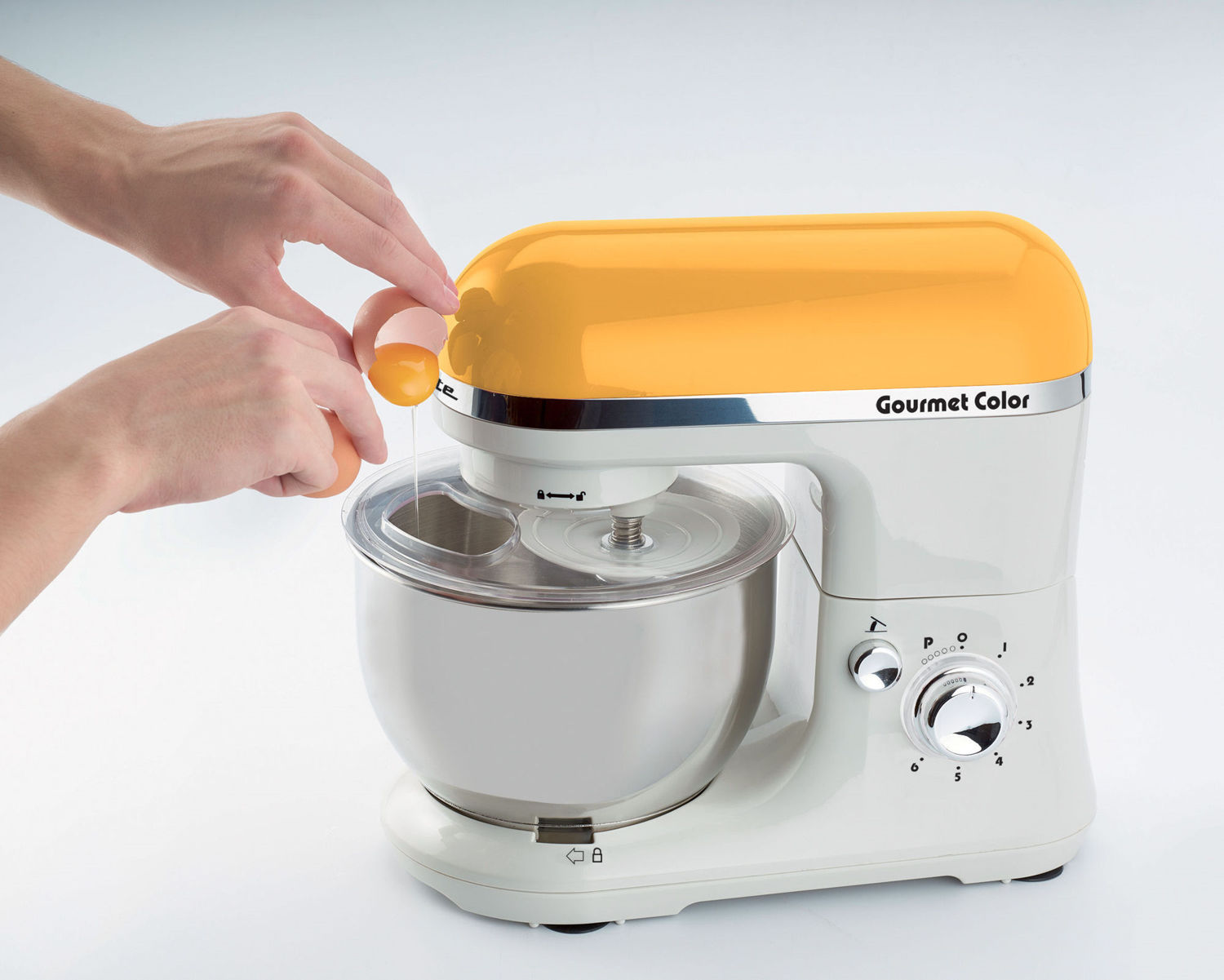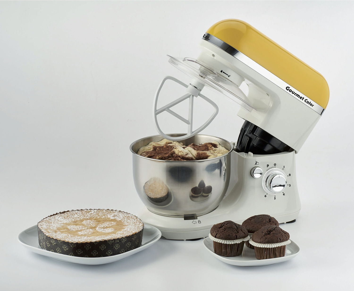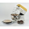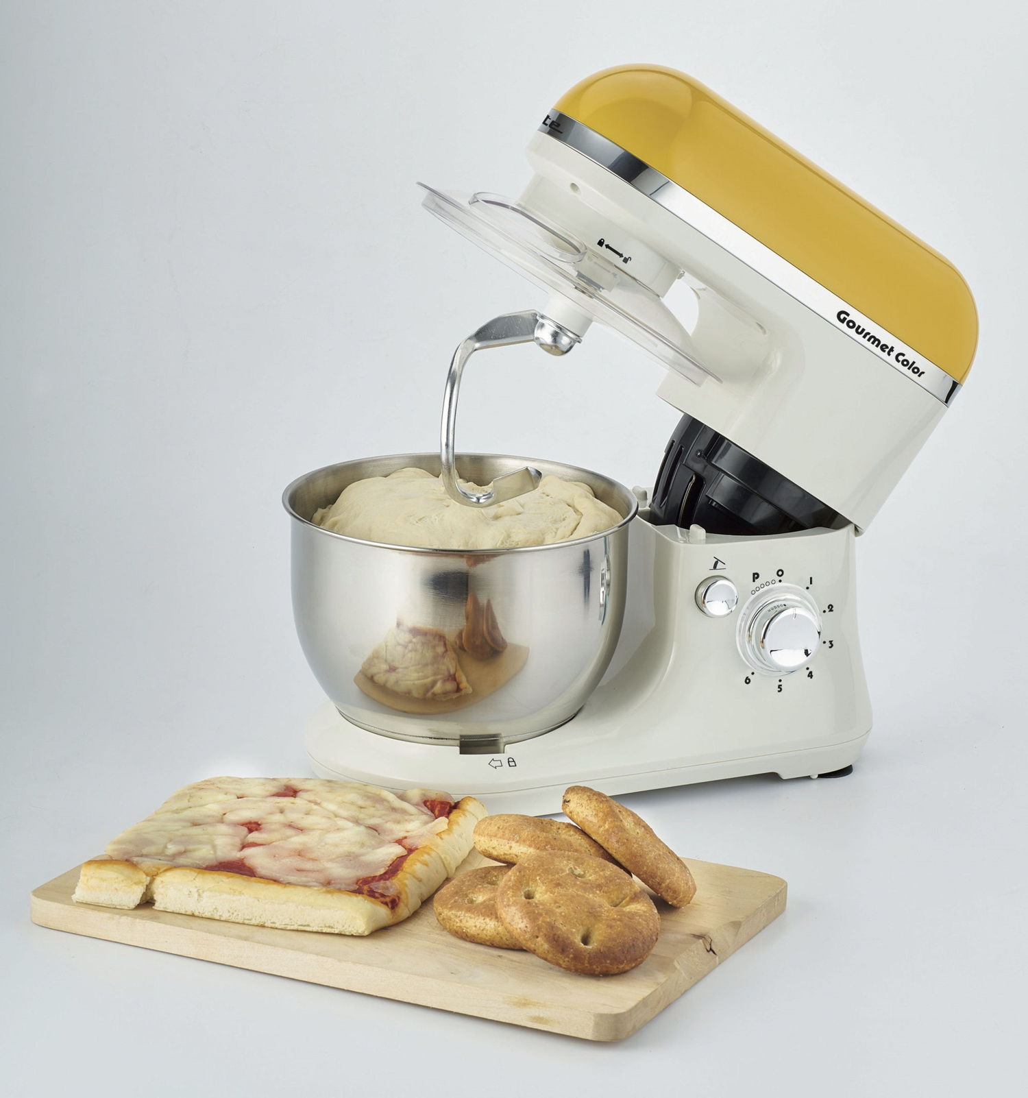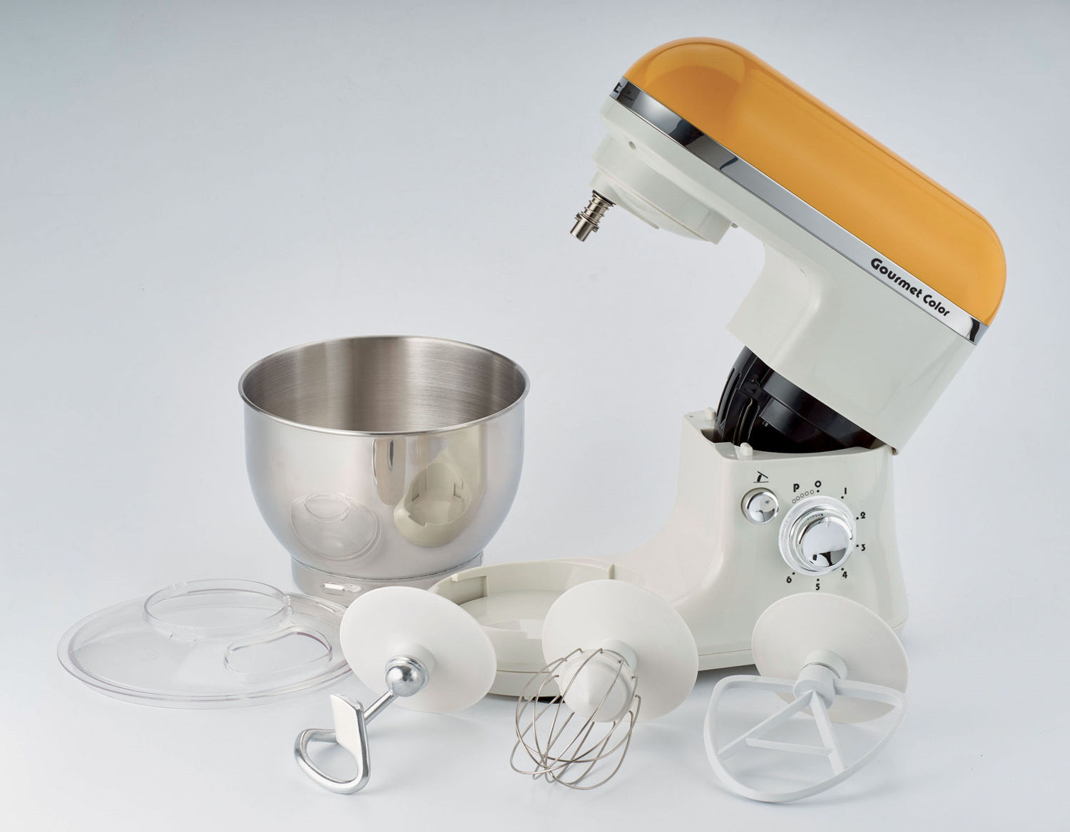 Gourmet Color è un impastatore multifunzionale e colorato con ciotola in acciaio inox (4 lt) dotata di paraschizzi. Impasta e monta grazie alle 6 velocità (presente anche la funzione Pulse) ed ai 3 accessori in dotazione: gancio per impasti morbidi, gancio per impasti duri e frusta a filo per montare.