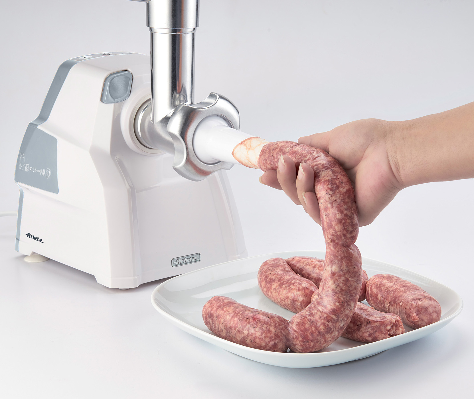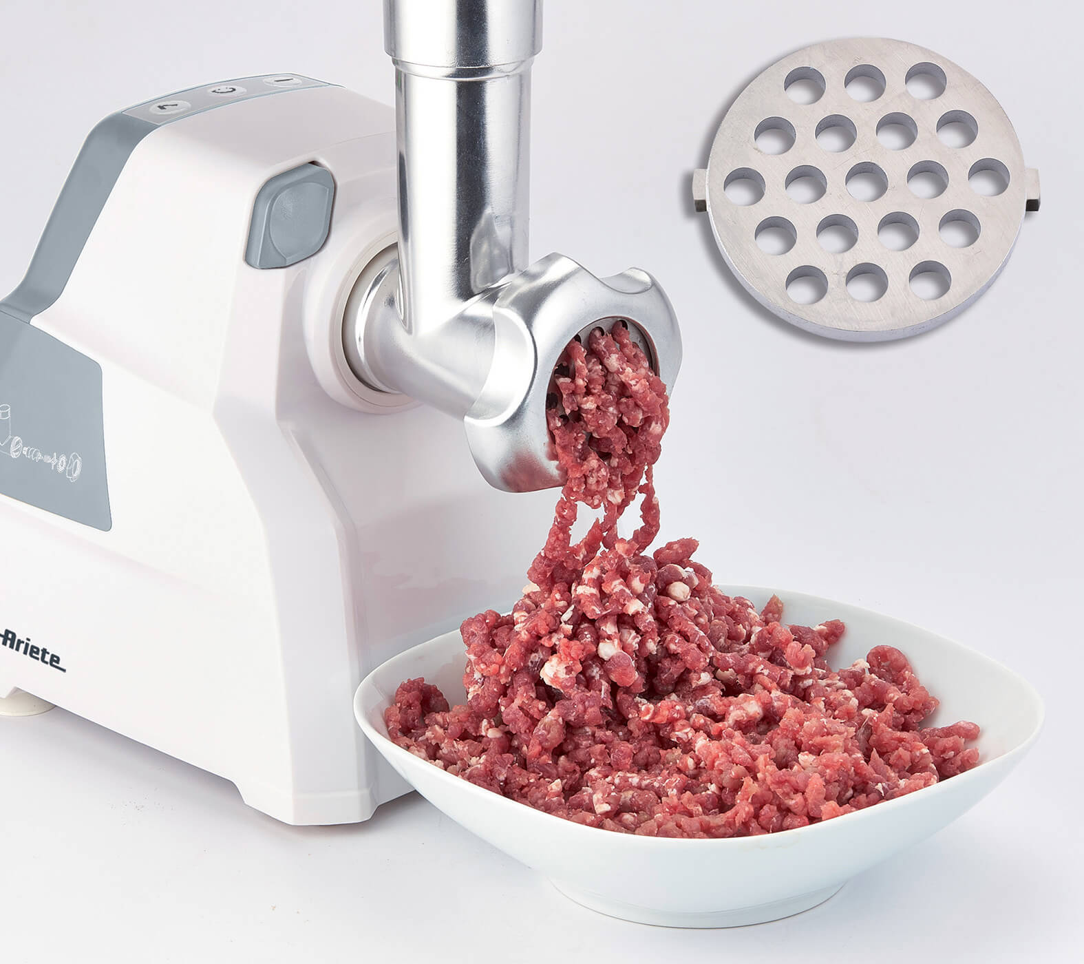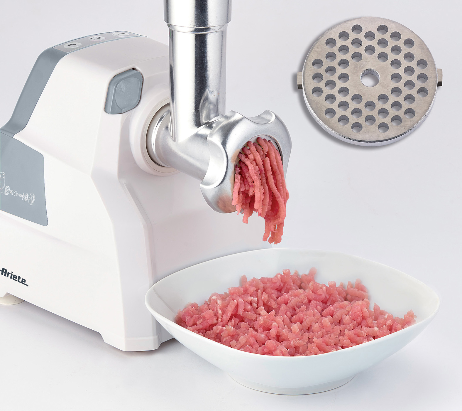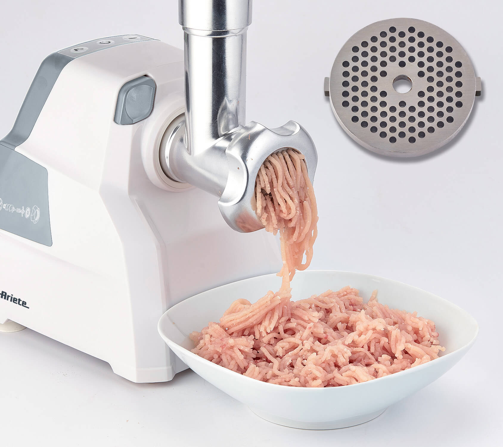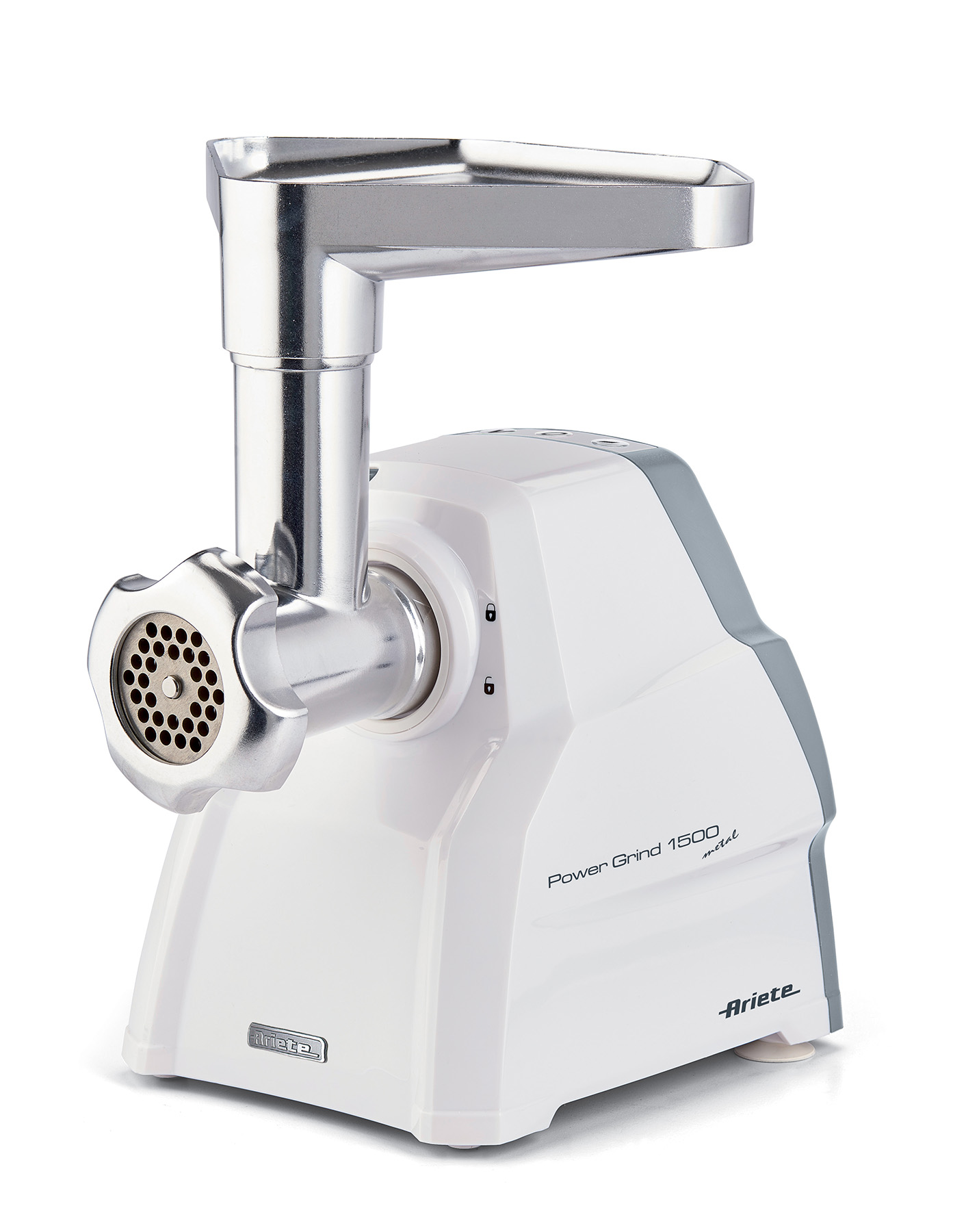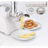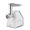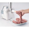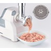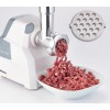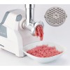 Compatto e potente tritacarne con tubo di alimentazione e vite in alluminio corredato con un set completo di lame ed accessori.