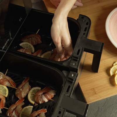 Shrimp and bacon skewers in air fryer are an irresistible appetizer that combines the delicate flavor of shrimp with the crispness and savoriness of bacon, perfectly cooked in the air fryer.