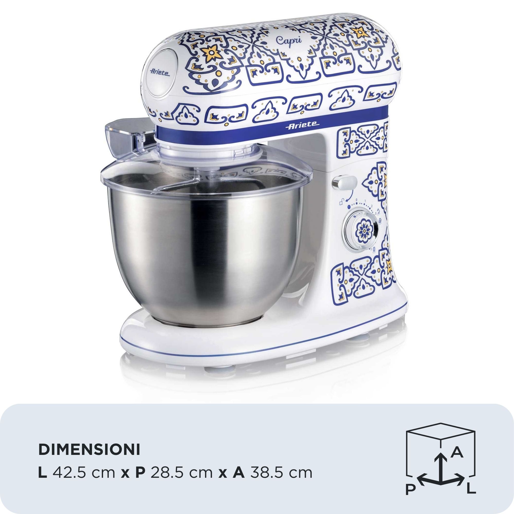 The Capri planetary mixer will make it easier to prepare the more elaborate recipes you would like to make at home, such as bread, homemade pasta, but also pizza, leavened products and special cakes that would require long preparation times. You choose the recipe, the Ariete planetary mixer does it all for you! With its 5.5-litre capacity stainless steel cup, the planetary mixer allows you to process large quantities of ingredients with the best performance, thanks to its 2400Watt motor. You can also adjust the speed, choosing from 7 available speeds, according to the recipe you want to prepare.