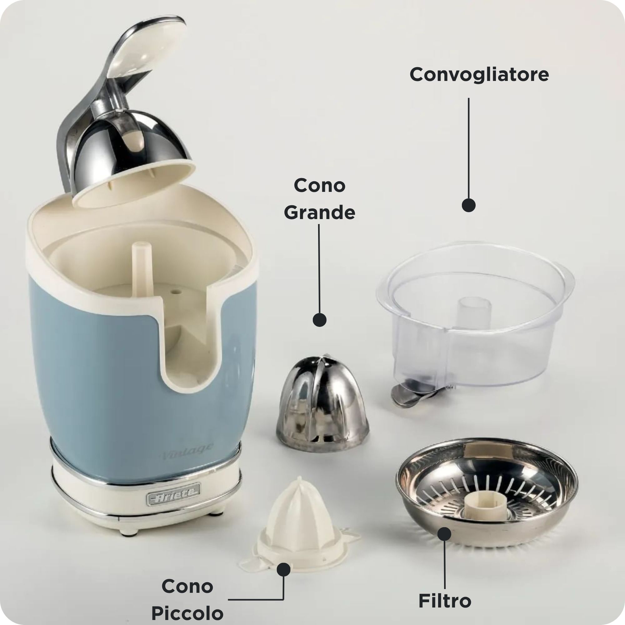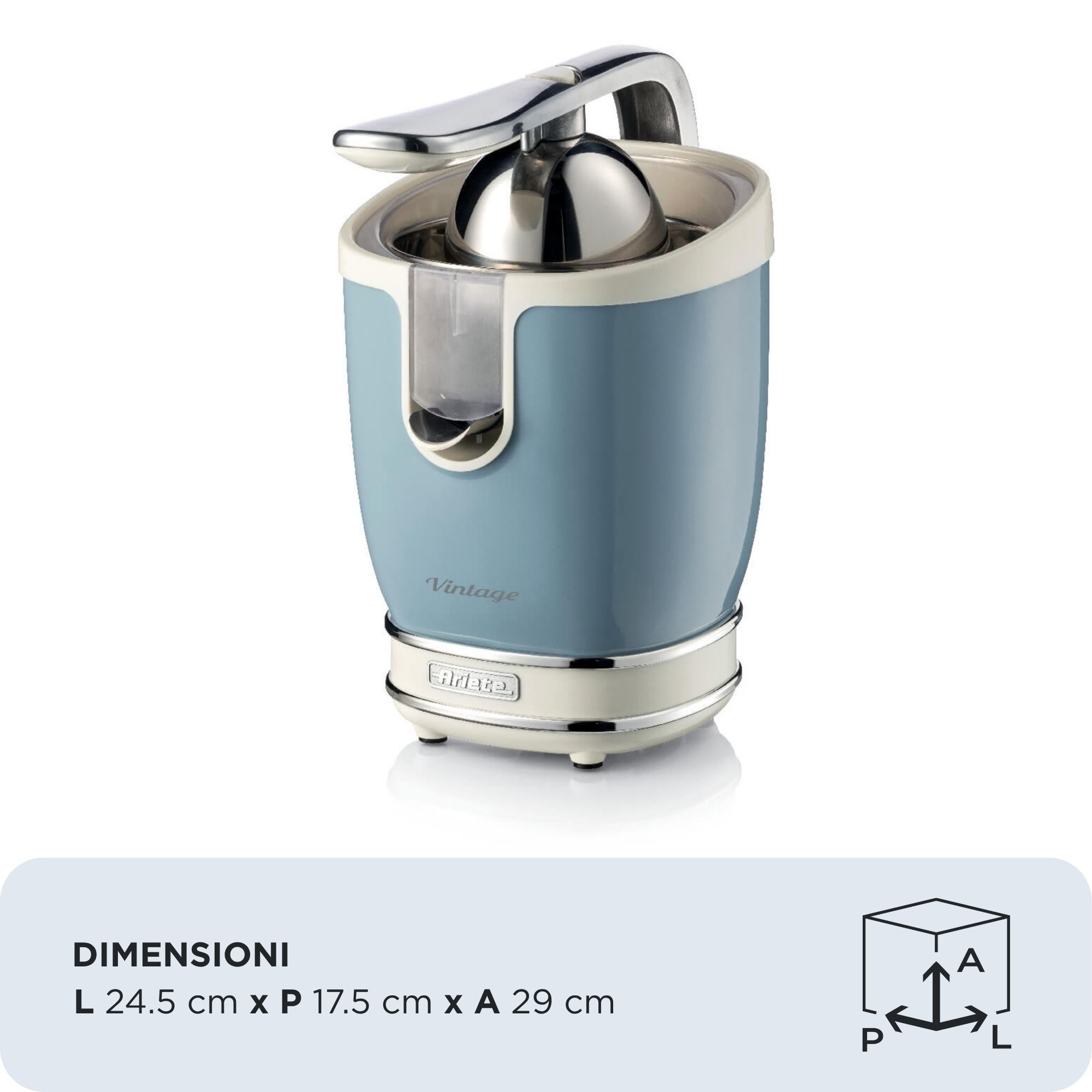 With the 2 cones supplied you can squeeze any citrus fruit, large or small: grapefruits, oranges, lemons, limes. Have fun creating a mix of squeezed juices to suit every taste with Ariete’s Vintage juicer.