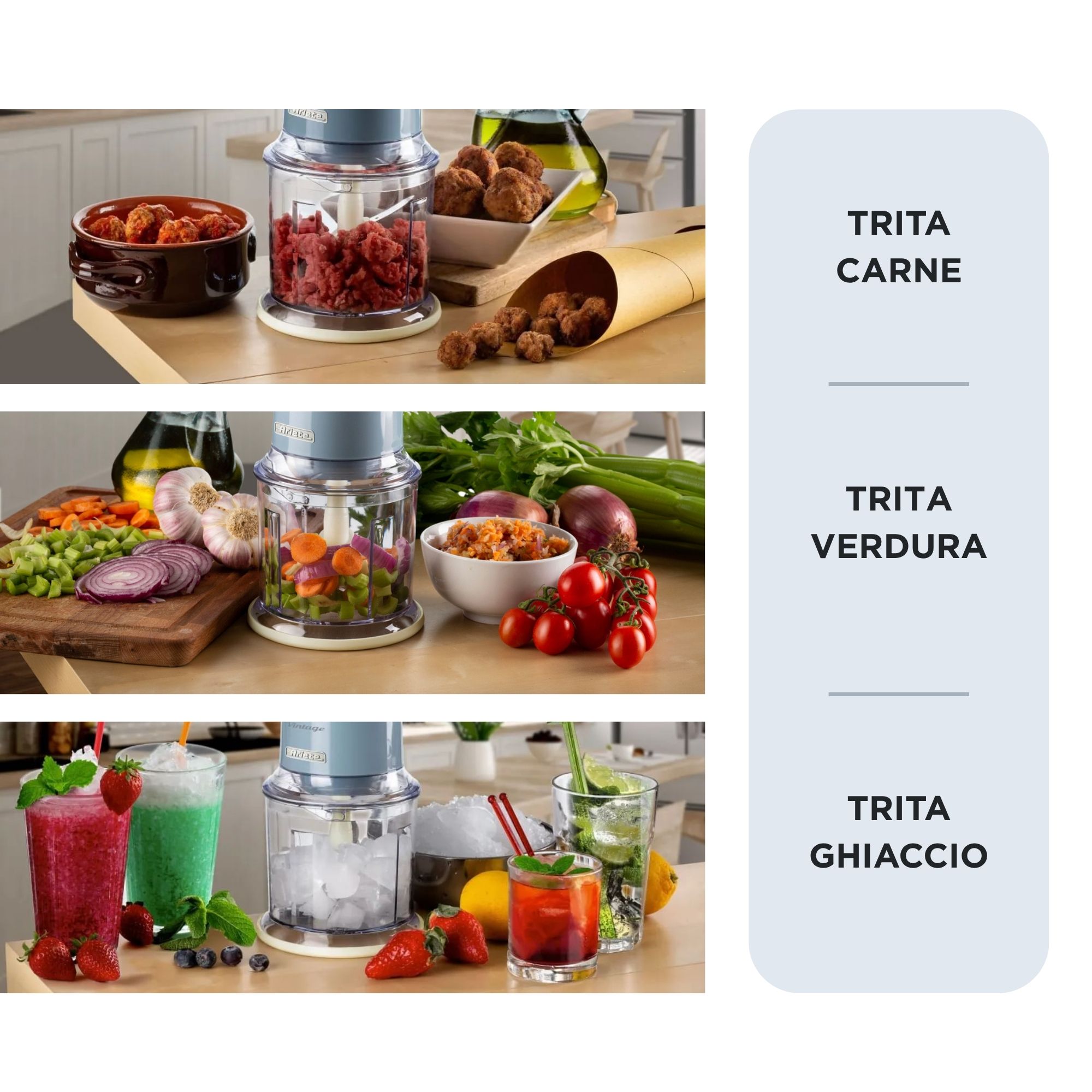 There is no homemade ragù without a good chopped onion, celery, carrots and parsley. With the Vintage chopper, you can reduce all smells evenly in a few moments to prepare the sauté for your tastiest recipes. Say goodbye to ready-made preparations! Thanks to the food processor, you can also prepare large quantities of meat ready to be frozen in convenient portions to use when you prefer.