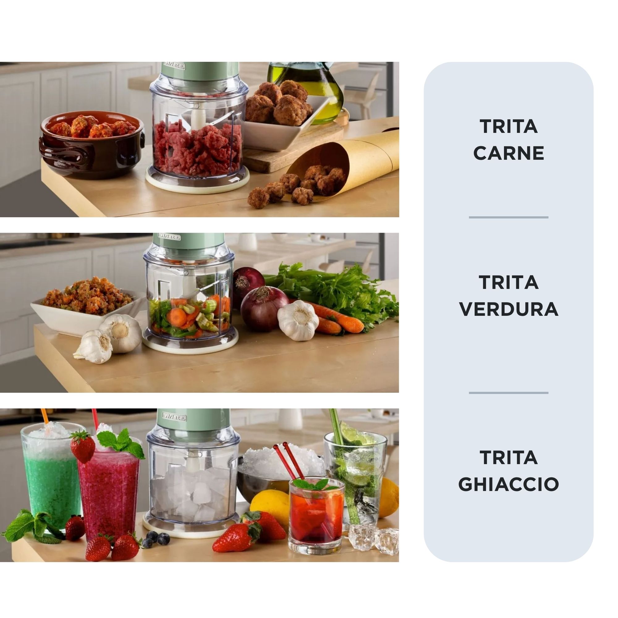 There is no homemade ragù without a good chopped onion, celery, carrots and parsley. With the Vintage chopper, you can reduce all smells evenly in a few moments to prepare the sauté for your tastiest recipes. Say goodbye to ready-made preparations! Thanks to the food processor, you can also prepare large quantities of meat ready to be frozen in convenient portions to use when you prefer.