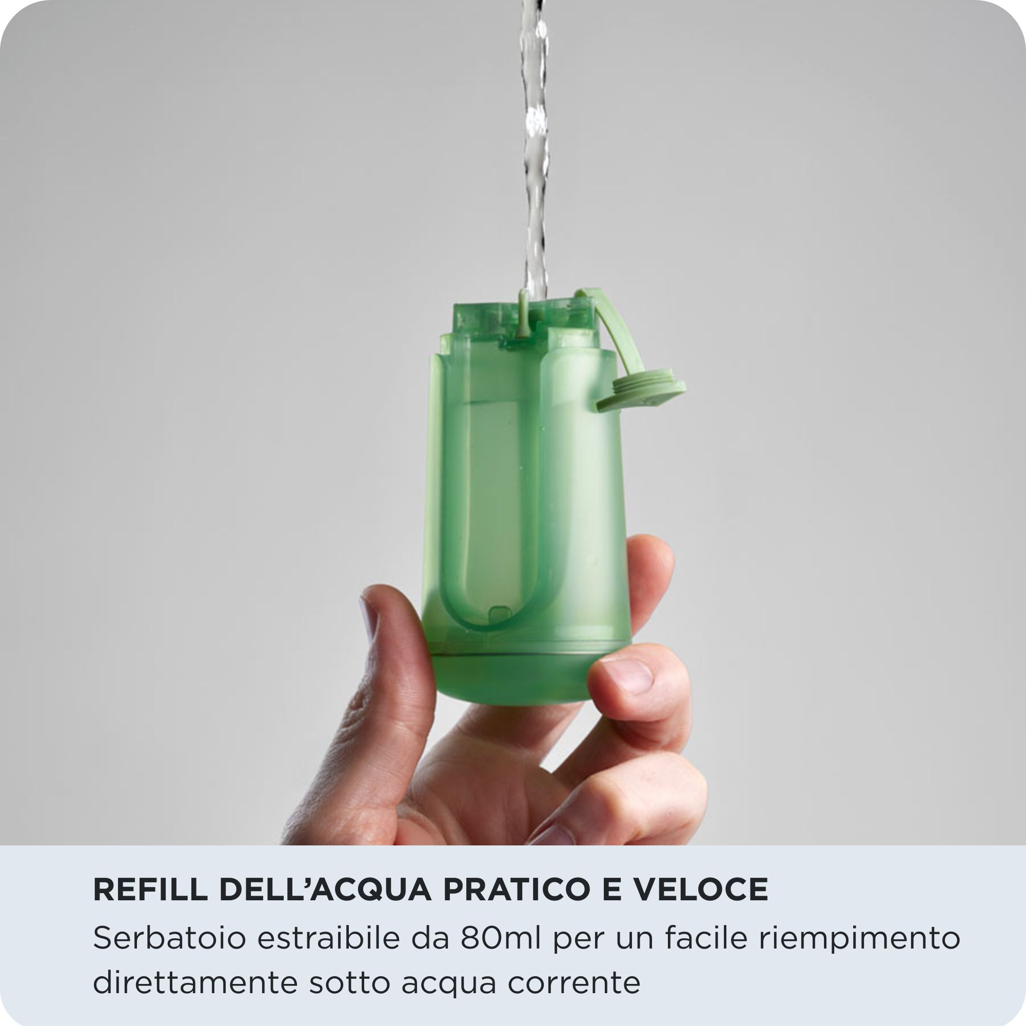 Pensata per chi vive in movimento è completa di una pratica spazzola rimuovi pelucchi (removibile con un click e adatta a tessuti più “spessi”) e una sacca resistente al calore per riporla subito dopo l'uso sia in borsa che in casa