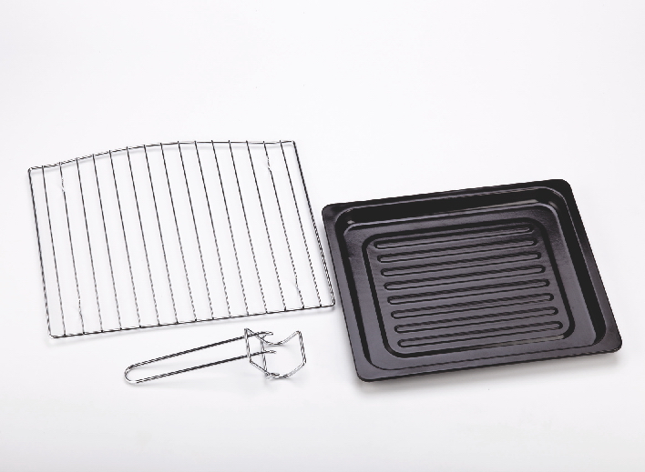 В комплекте: решетка для гриля, противень для выпекания с ручкой, поддон для крошек.