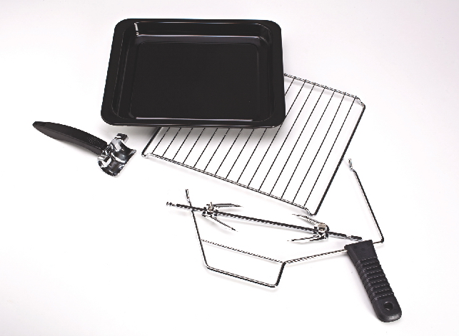 В комплекте: решетка для гриля, противень для выпекания с ручкой, вертел.