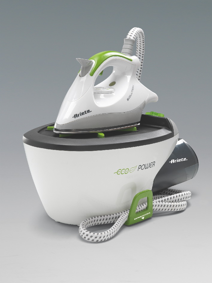 Ariete’s new energy-saving, steam-generating iron is here. Minimum power consumption and excellent performance, thanks to its dual pressure switch for maximum savings (30%) and lower environmental impact, plus excellent ironing results. Eye-catching design, “green” colouring and the utmost attention to detail: cord winder integrated into the base; anti-scale system for maximum durability; removable tank; modern iron with non-slip, ergonomic handle and easy, comfortable use. The practical cord winder on the side means it is easier to store the appliance in more compact spaces. Soft, non-slip inserts in silicone give the iron the maximum stability during pauses.
