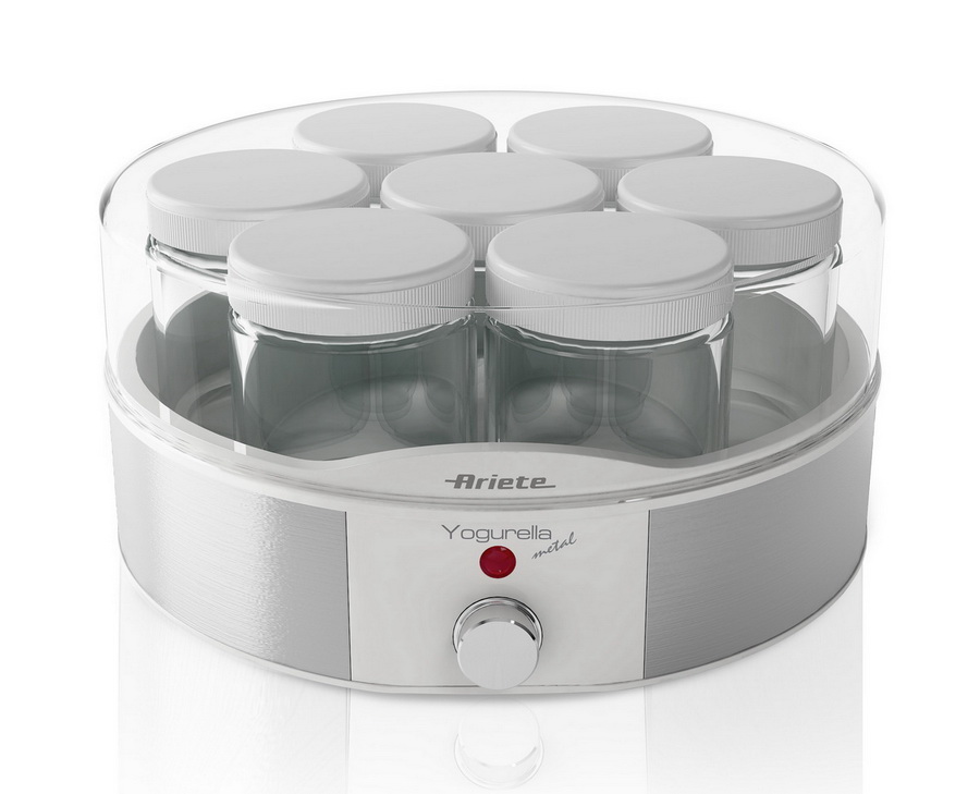 A special combination of quality and design brings you Yogurella Metal: the only handy, practical yogurt maker. Seven individual pots with screw caps mean it is possible to make up to 1 kilo of thick, creamy yogurt, in a variety of flavours, to enjoy at home, school or work.